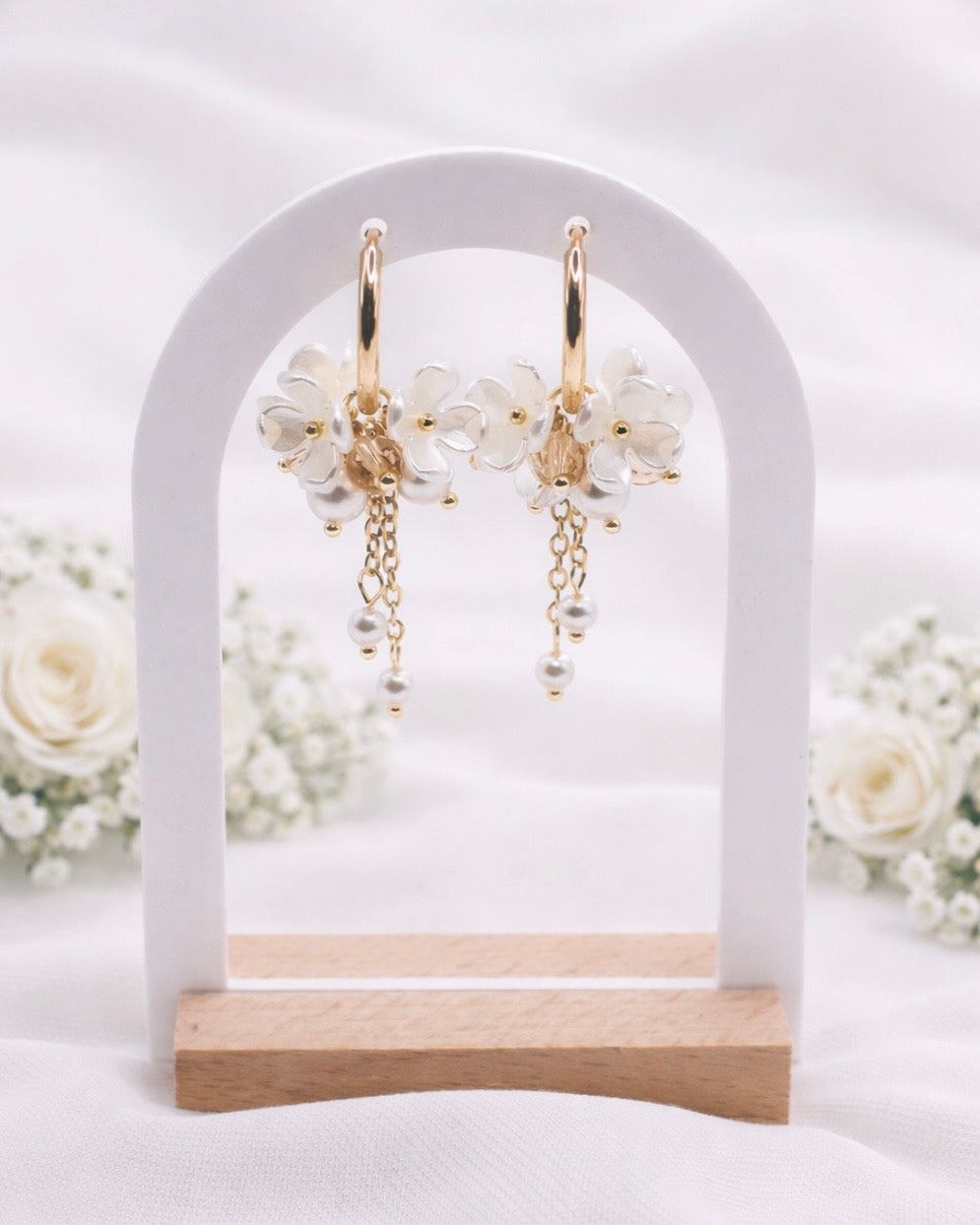 Koruista riippuu ketjut, joiden päässä on sirot helmet. Huggie-renkaiden halkaisija on n. 18 mm.