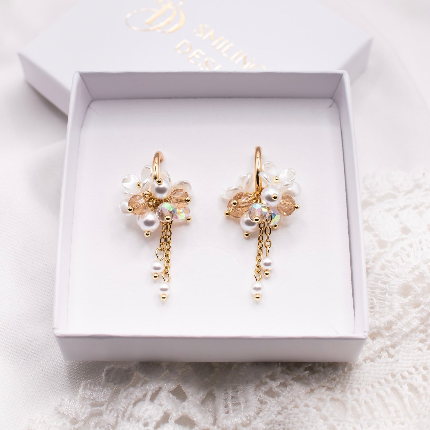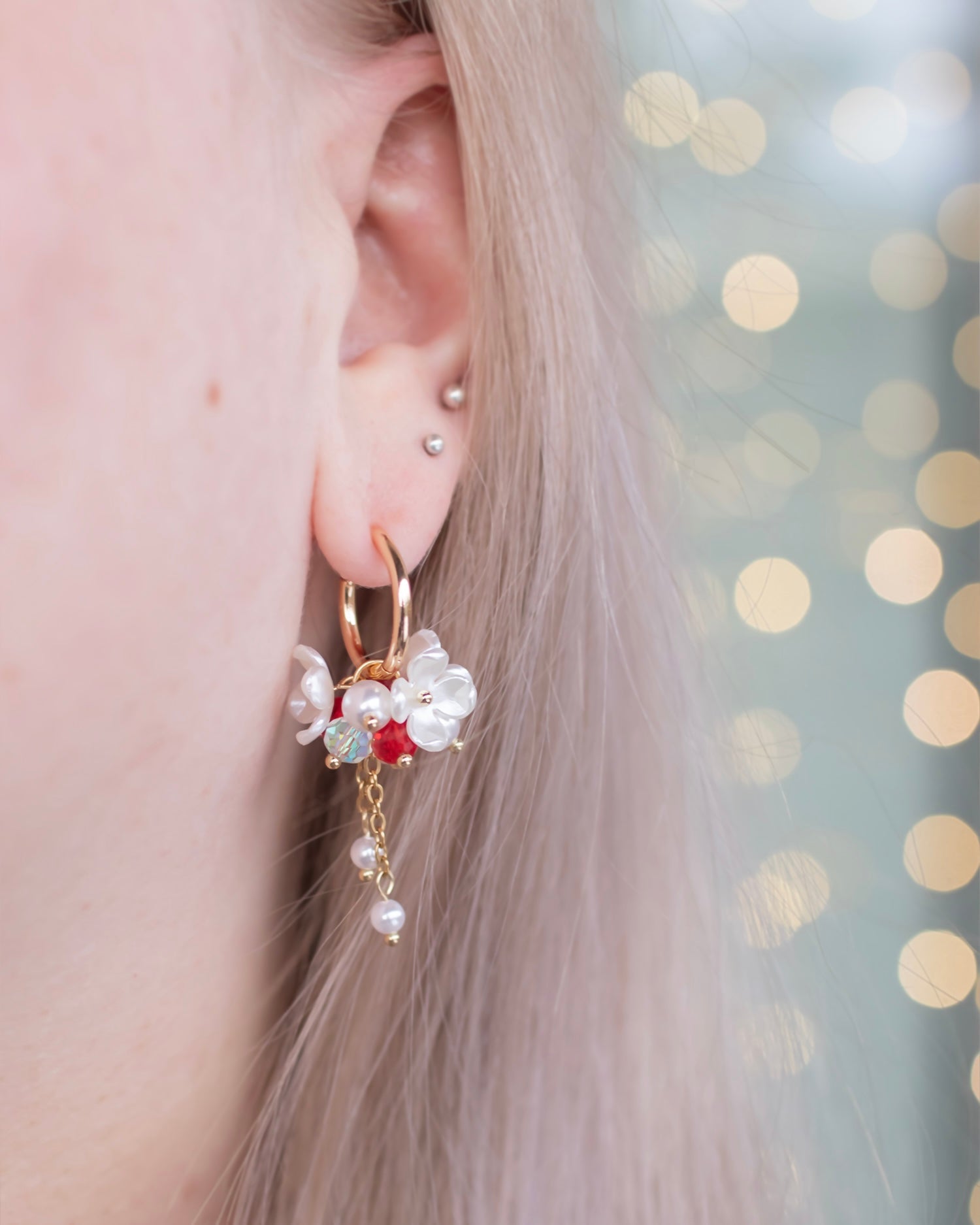 Herkät helmikorvakorut, joissa on erilaisia lasihelmiä sekä hohtavia akryylikukkia.