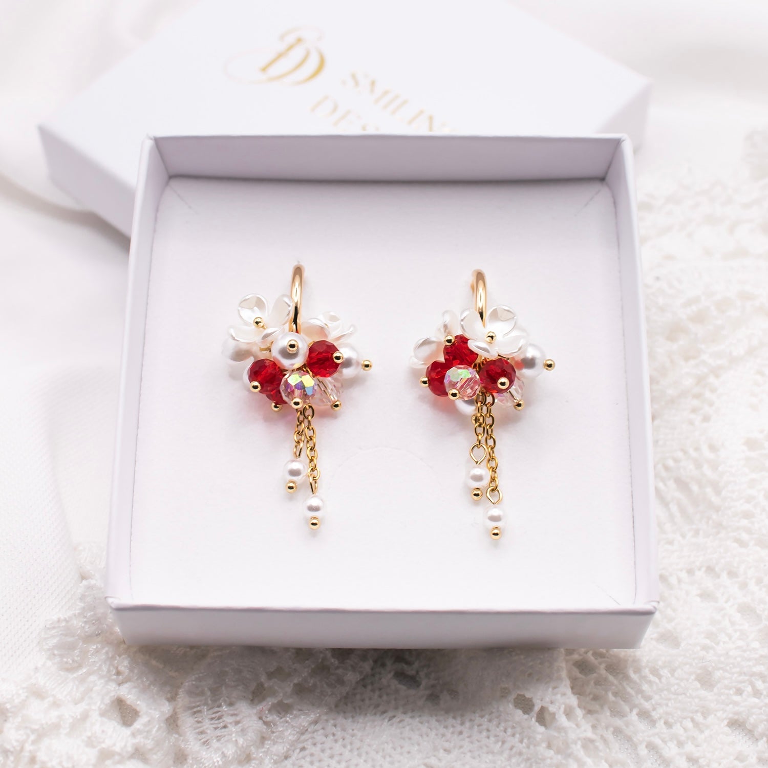 Upean juhlavat helmikorvakorut, joissa on erilaisia lasihelmiä sekä hohtavia akryylikukkia.