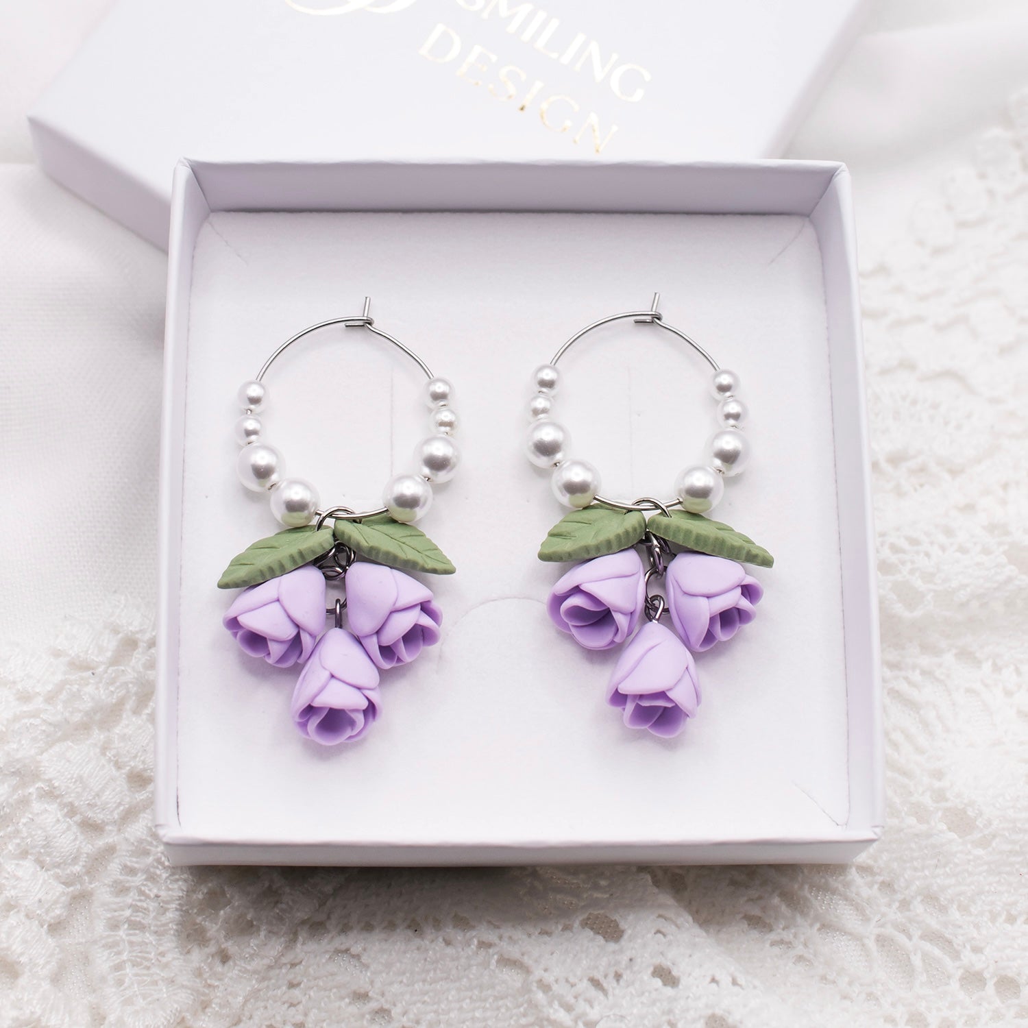 Herkät, kauniit kukkakorvakorut, jotka riippuvat ihanassa helmirenkaassa.