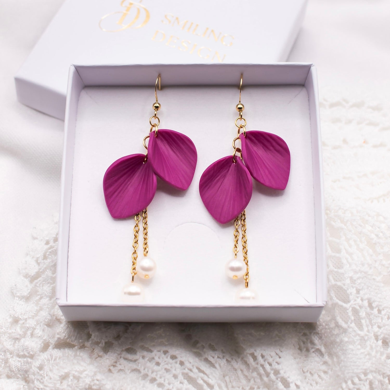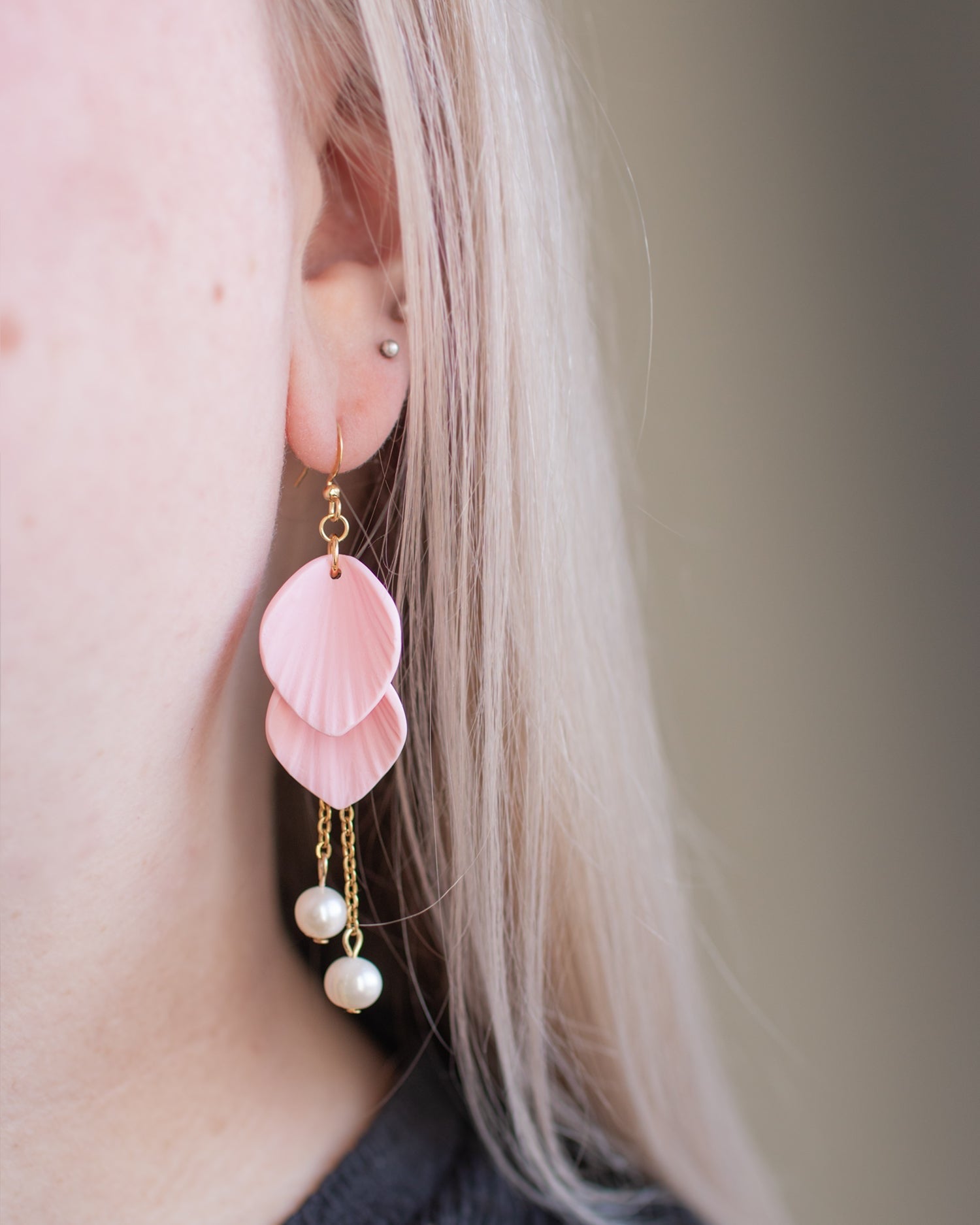 Tyylikkäät korvakorut, joissa riippuu yksittäisiä kukan terälehtiä ja aitoja makeanvedenhelmiä.
