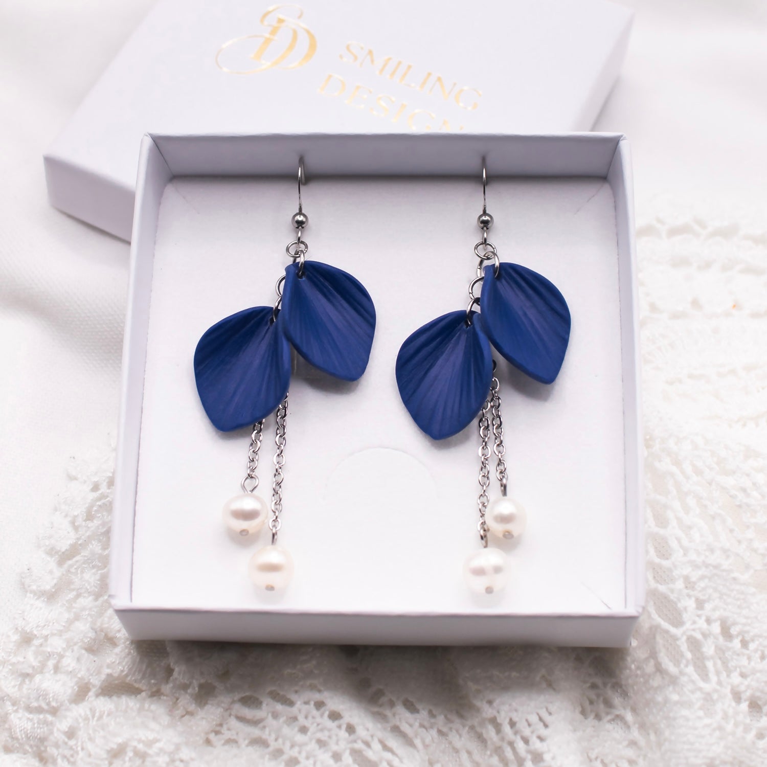 Tyylikkäät korvakorut, joissa riippuu yksittäisiä kukan terälehtiä ja aitoja makeanvedenhelmiä.
