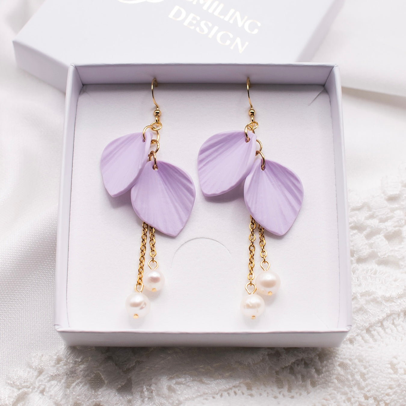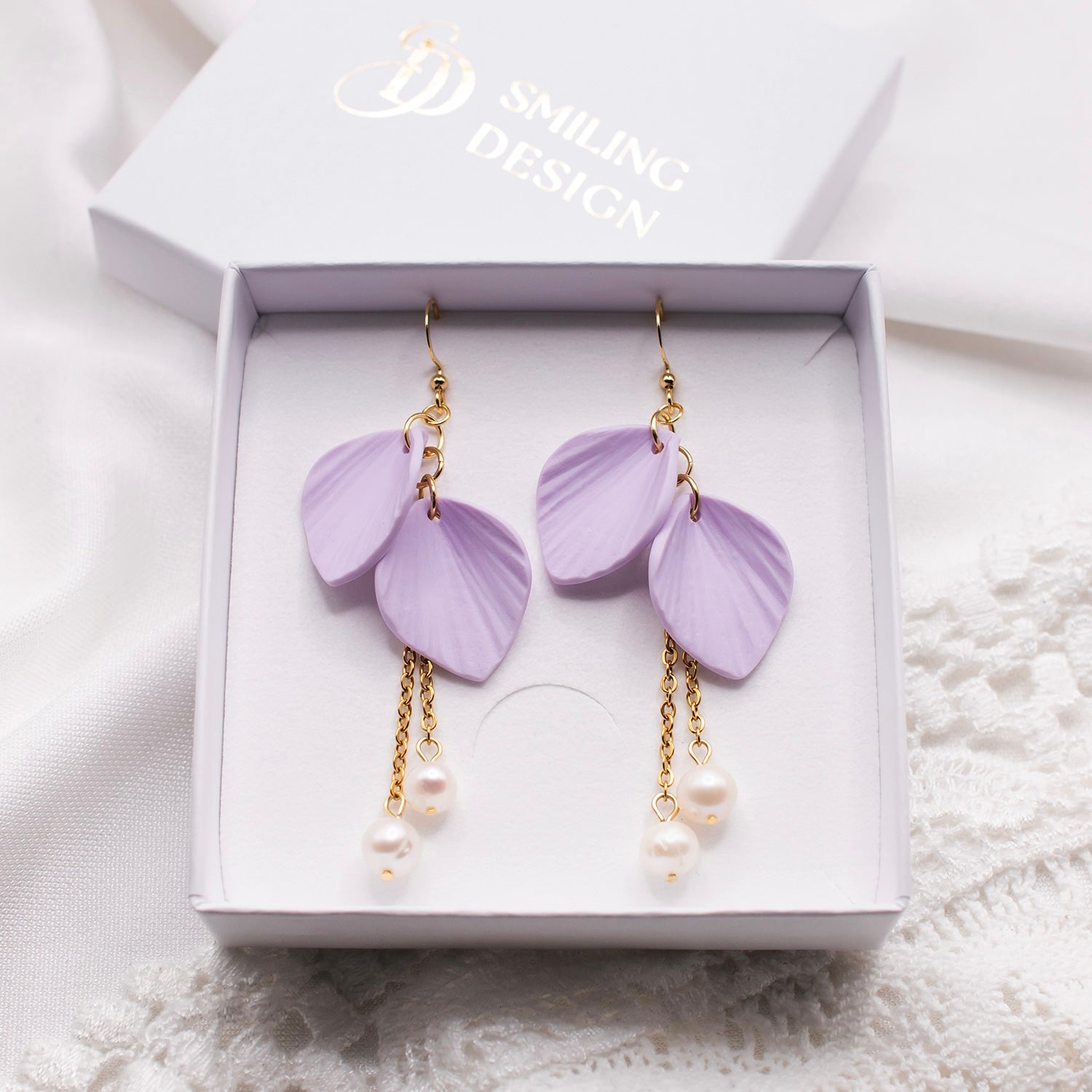 Tyylikkäät korvakorut, joissa riippuu yksittäisiä kukan terälehtiä ja aitoja makeanvedenhelmiä.