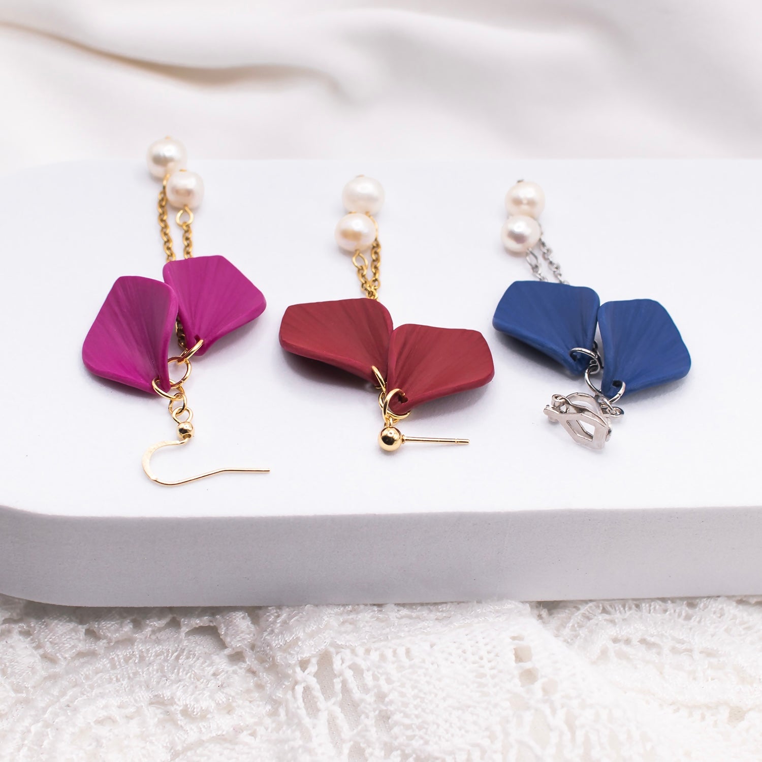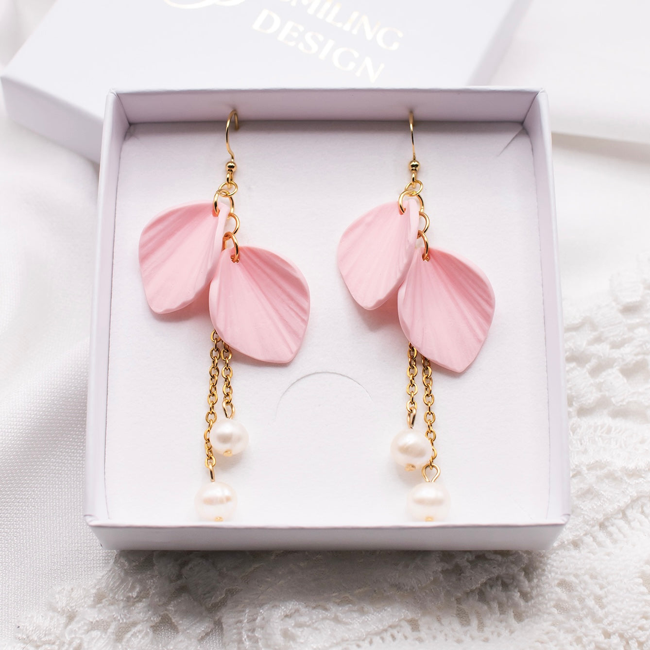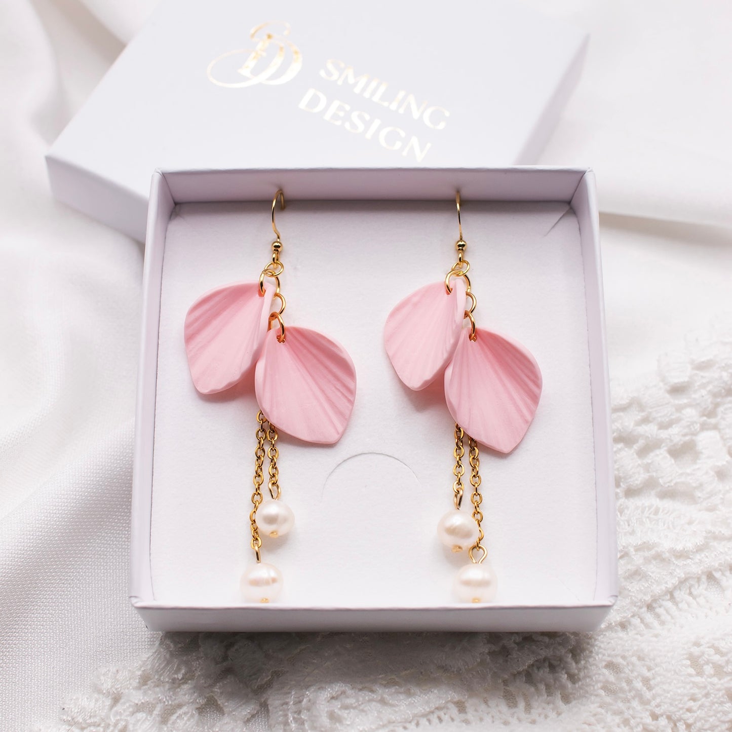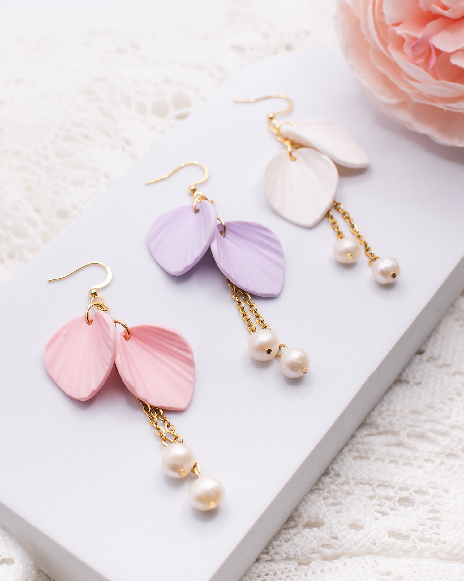 Tyylikkäät korvakorut, joissa riippuu yksittäisiä kukan terälehtiä ja aitoja makeanvedenhelmiä.