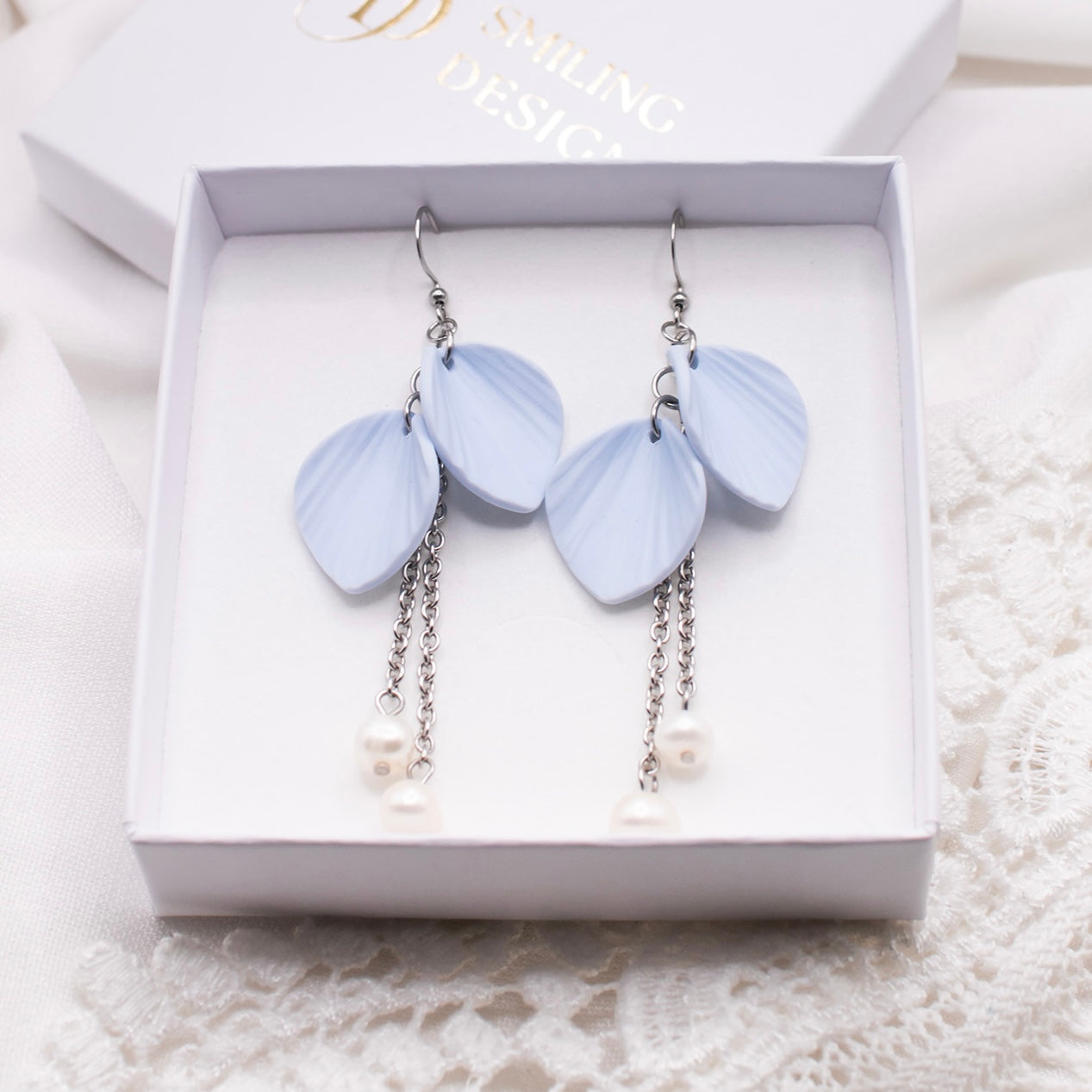 Tyylikkäät korvakorut, joissa riippuu yksittäisiä kukan terälehtiä ja aitoja makeanvedenhelmiä.