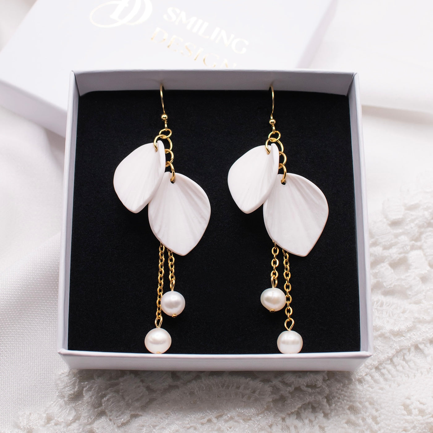 Tyylikkäät korvakorut, joissa riippuu yksittäisiä kukan terälehtiä ja aitoja makeanvedenhelmiä.