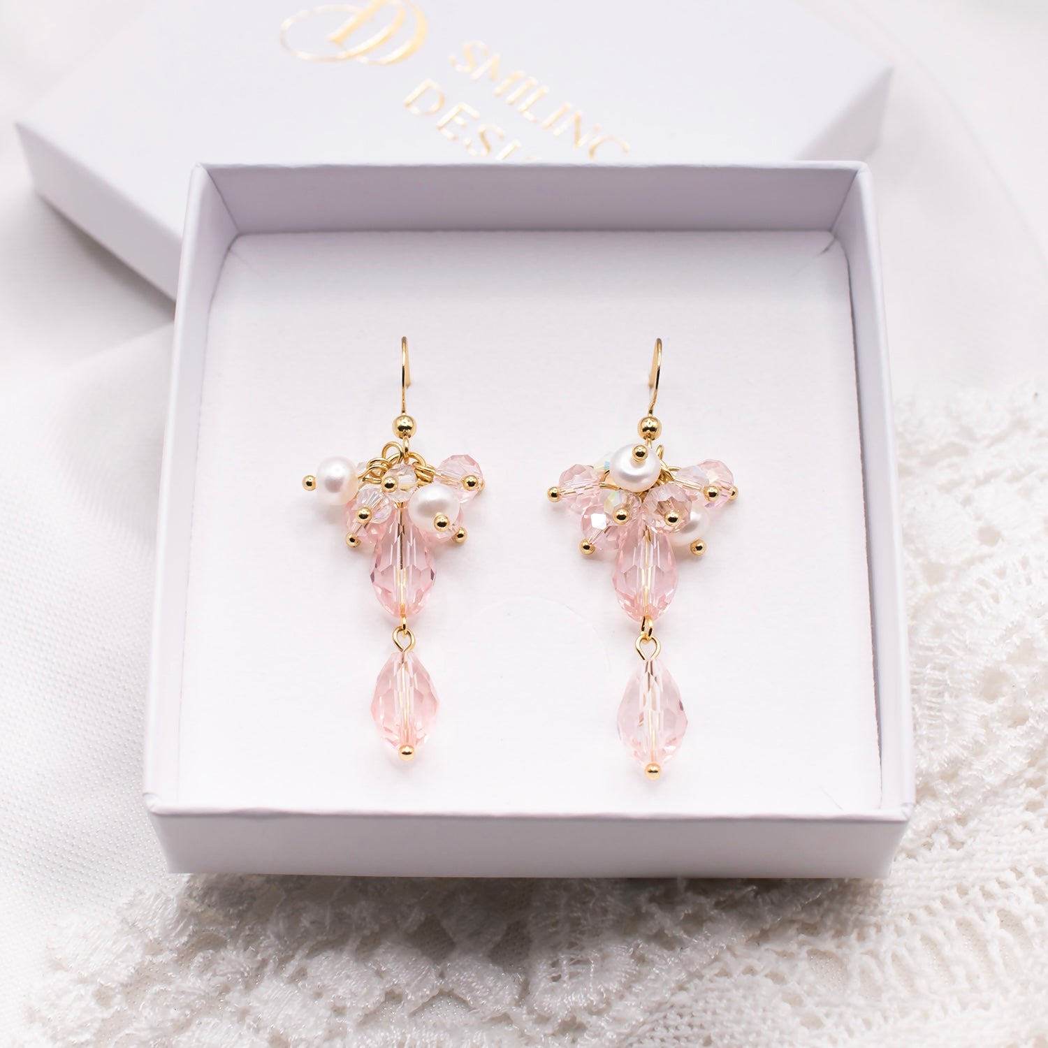 Hurmaavan näyttävät helmikorvakorut, joissa on hehkuvia fasettihiottuja lasihelmiä ja pieniä makeanvedenhelmiä.