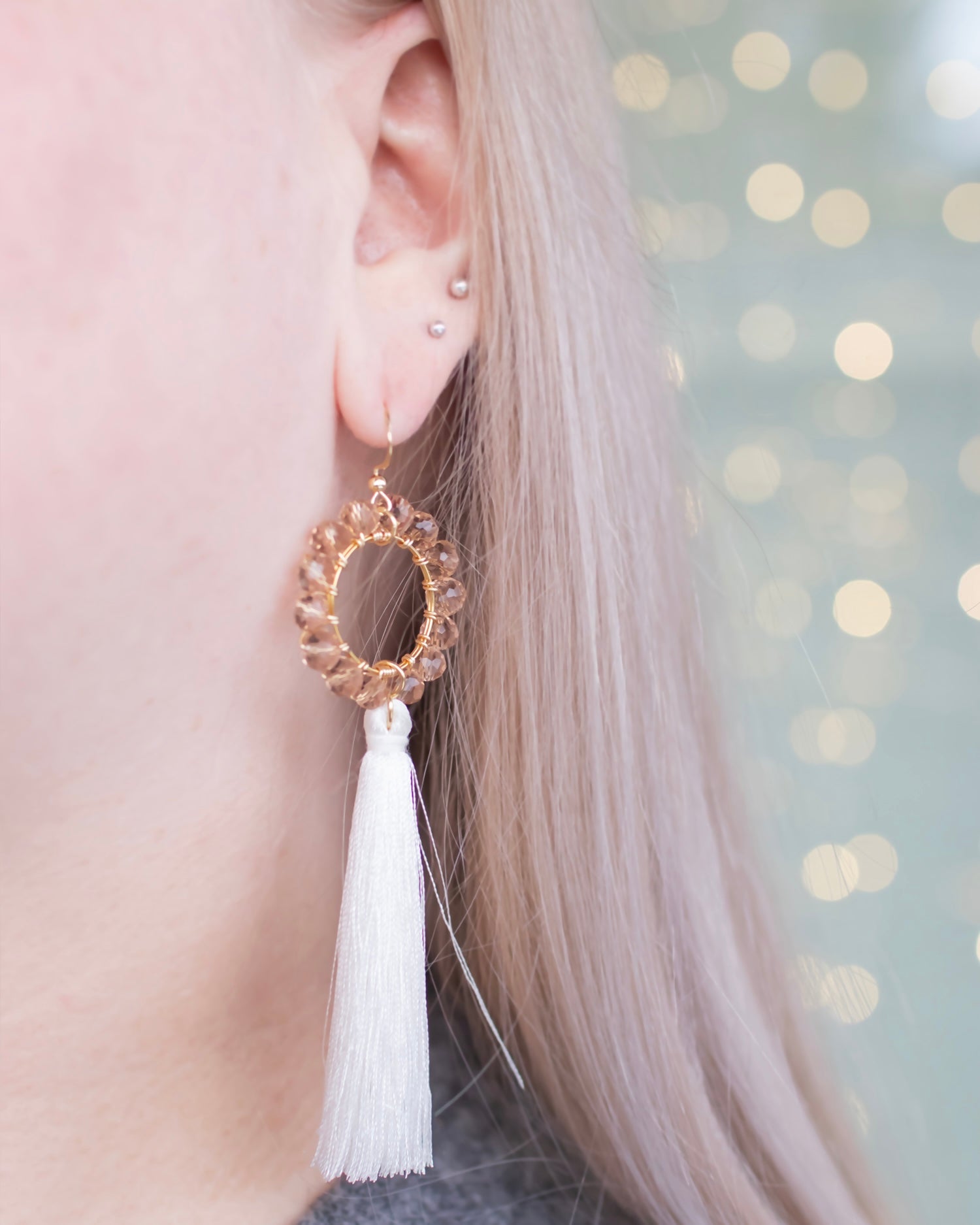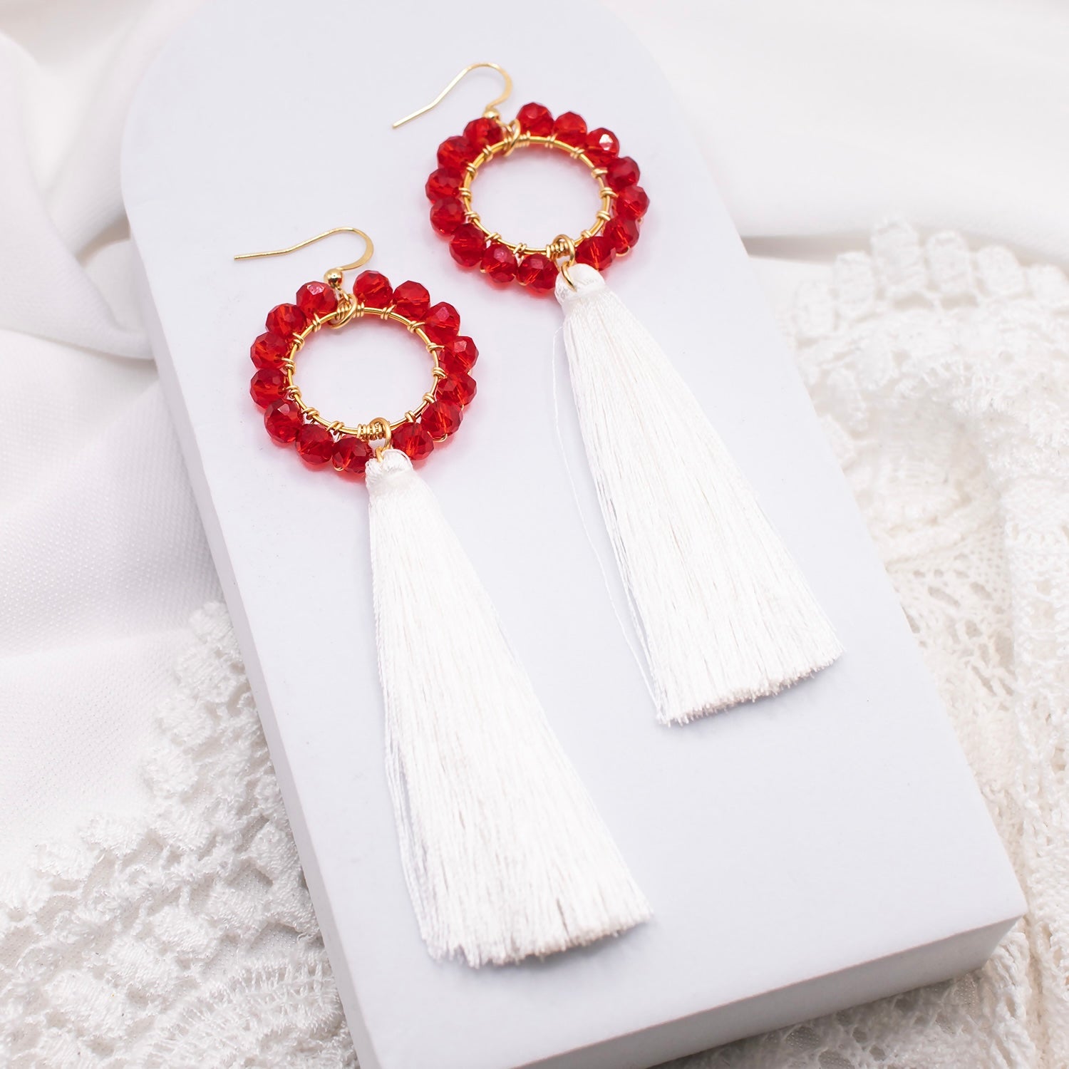 Elegantit tasselikorvakorut, joihin on punottu käsin kauniita lasihelmiä.