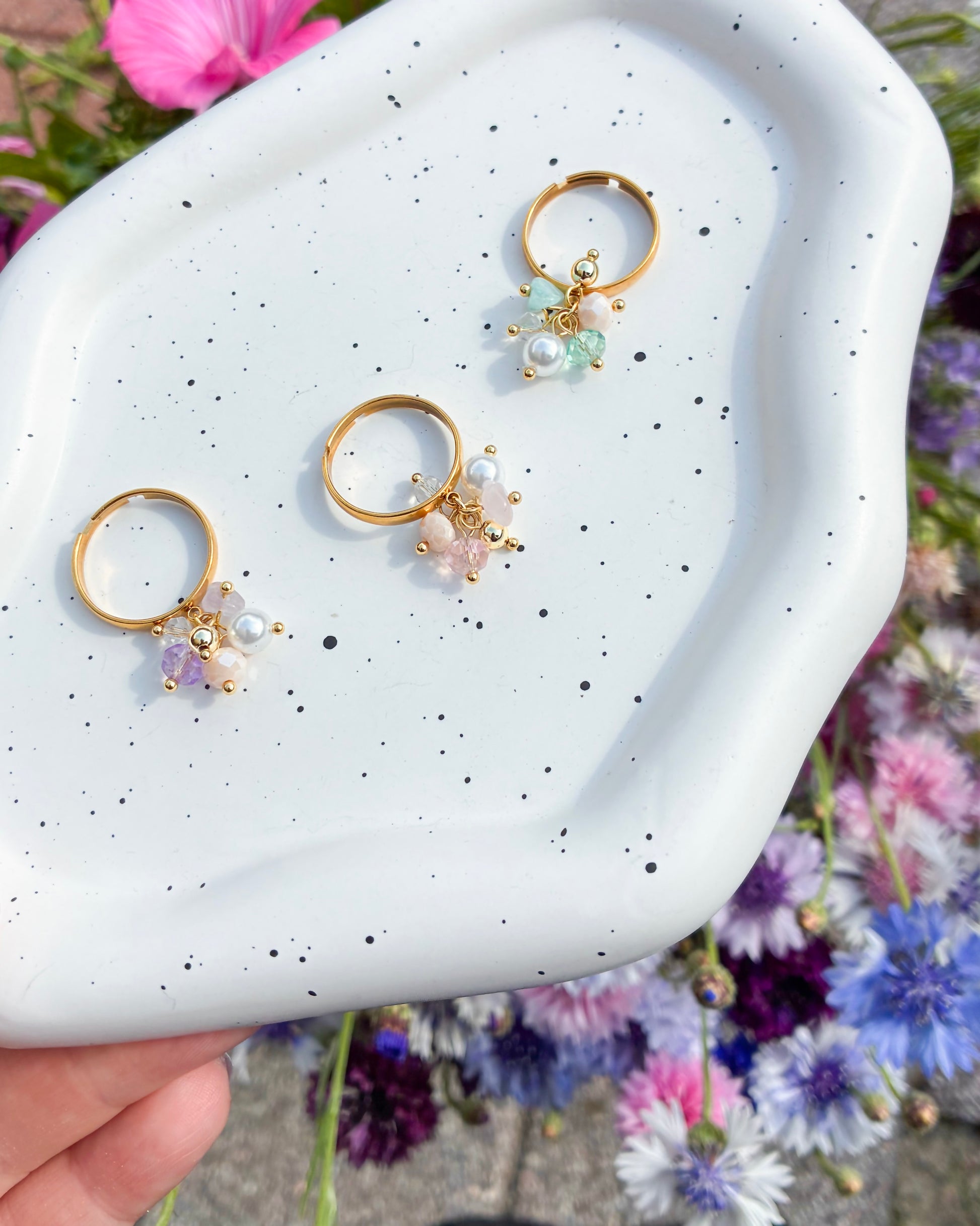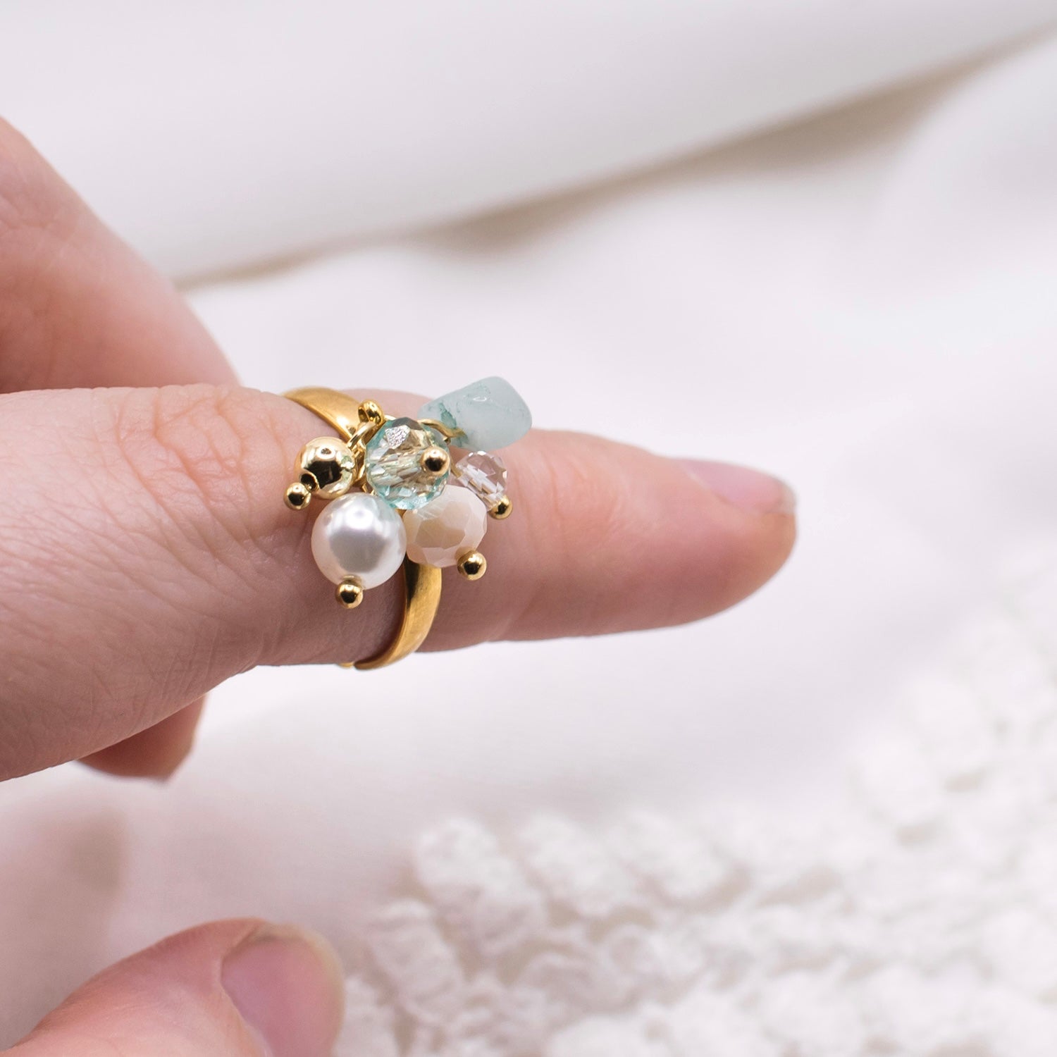 Candy-korusarjan sormuksessa on riipuksena kauniita lasi- ja kivihelmiä.