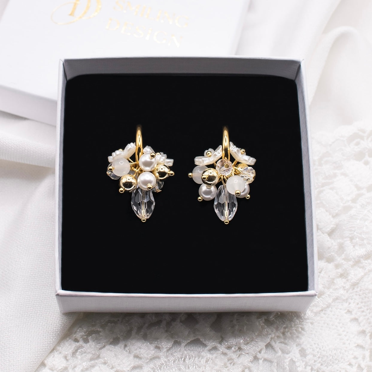 Korujen kruunu on ihanat valkoiset kukkahelmet. Huggie-renkaiden halkaisija on n. 18 mm.