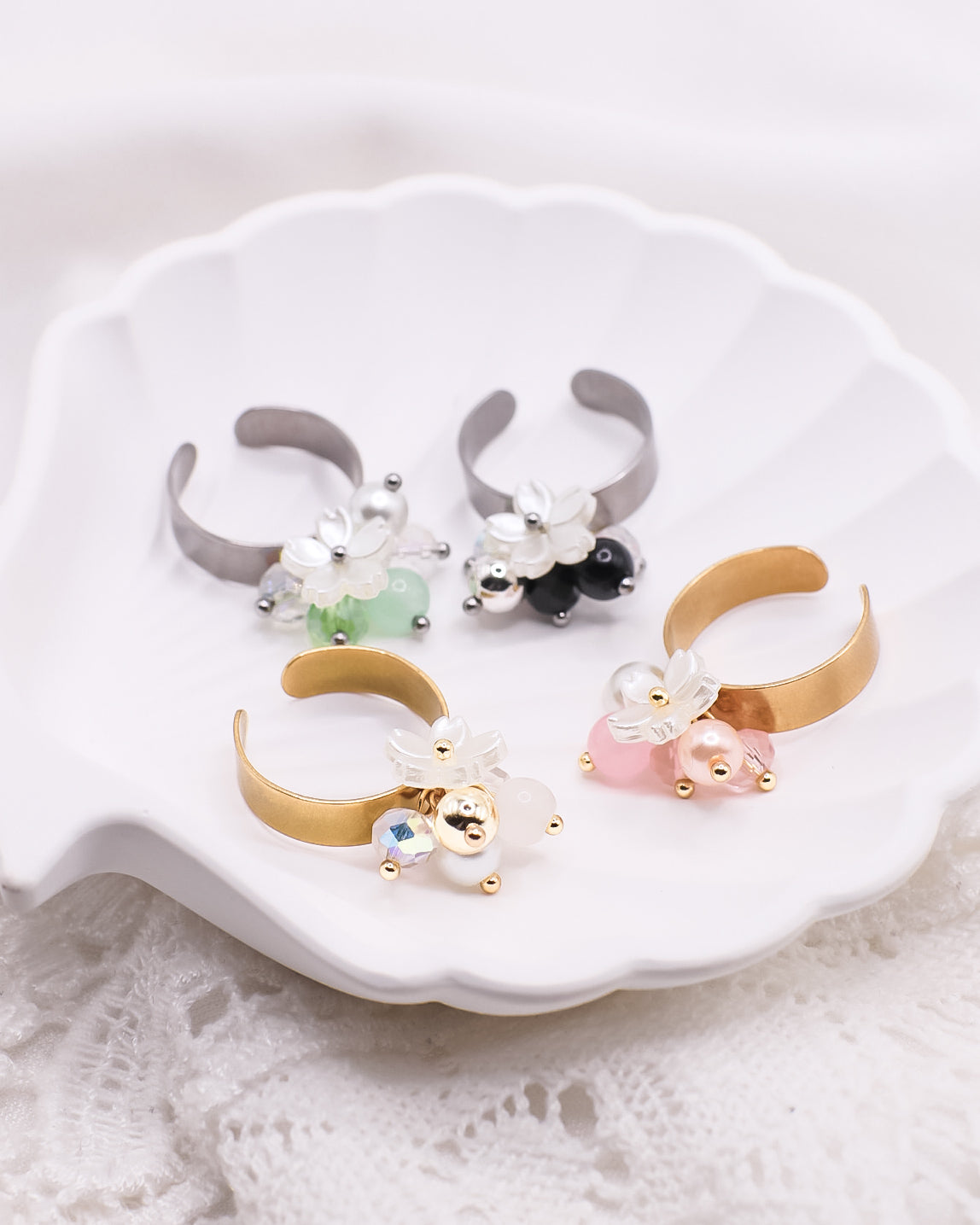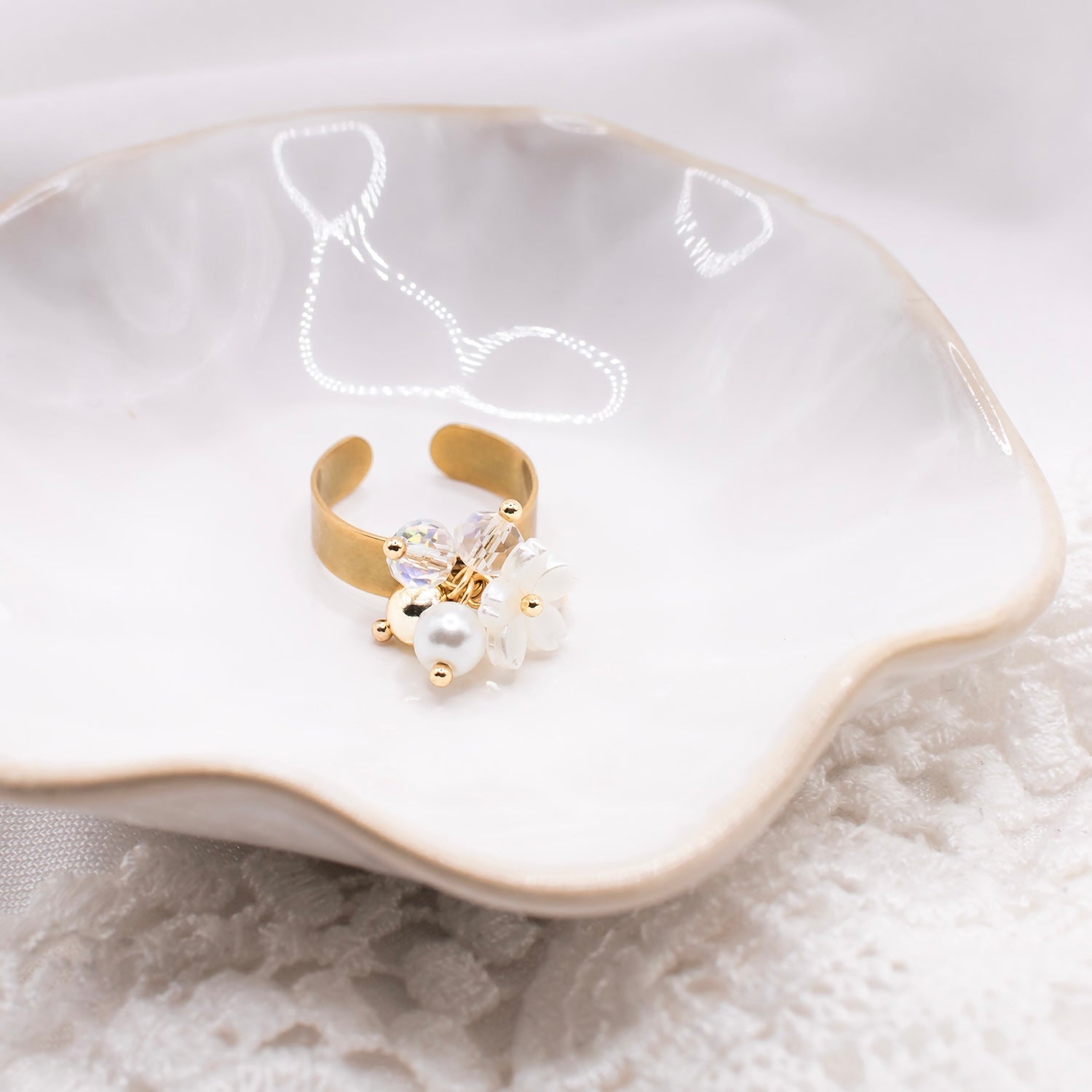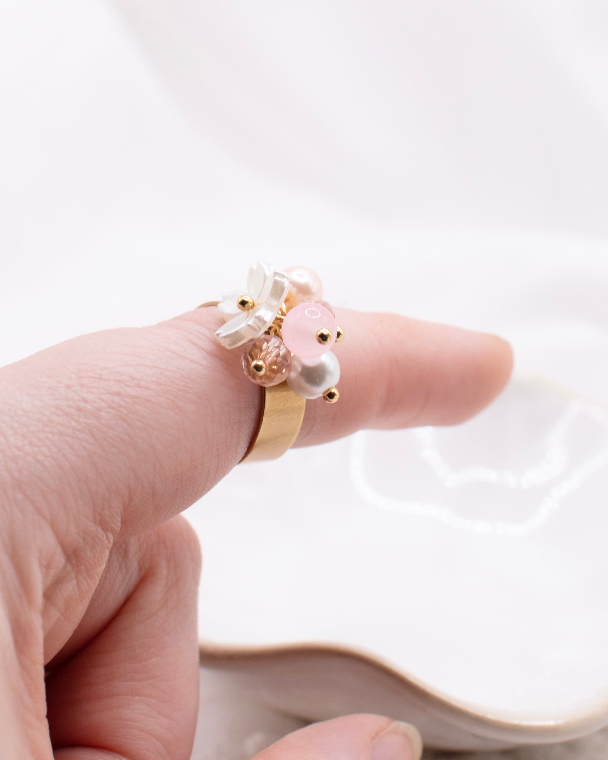 Ihana kimppumainen sormus, jossa on kauniita laadukkaita lasihelmiä ja kruununa valkoinen akryylikukka.