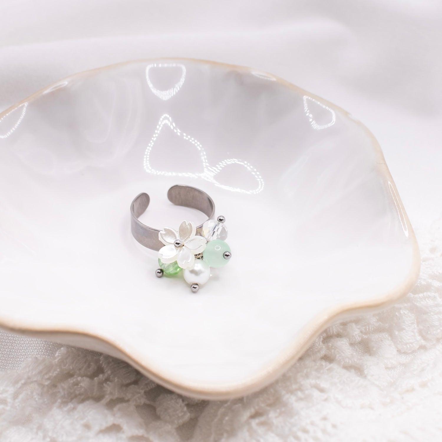 Ihana kimppumainen sormus, jossa on kauniita laadukkaita lasihelmiä ja kruununa valkoinen akryylikukka.
