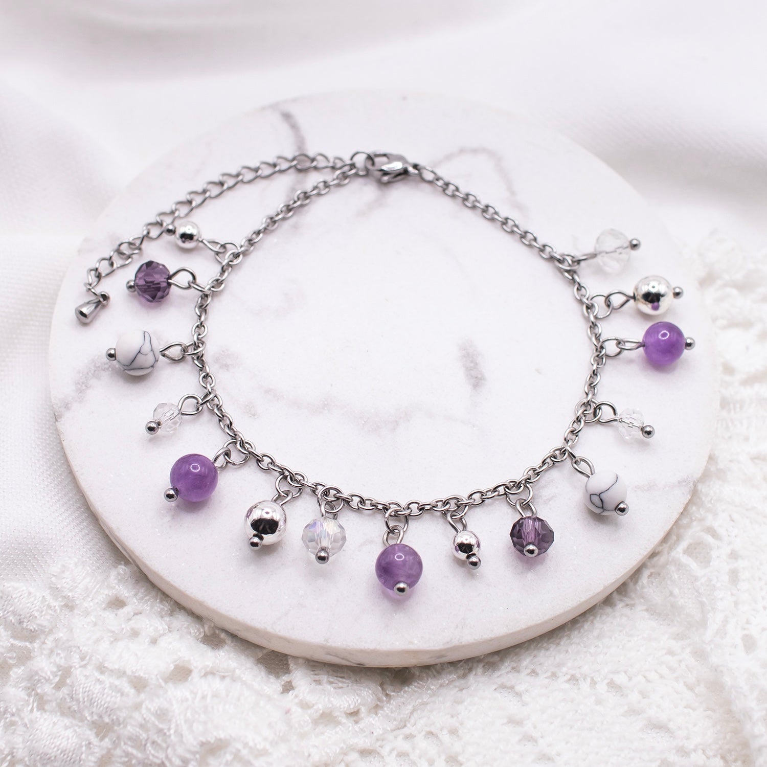 Näyttävä rannekoru, jossa riipuksina erilaisia lasi- ja kivihelmiä.