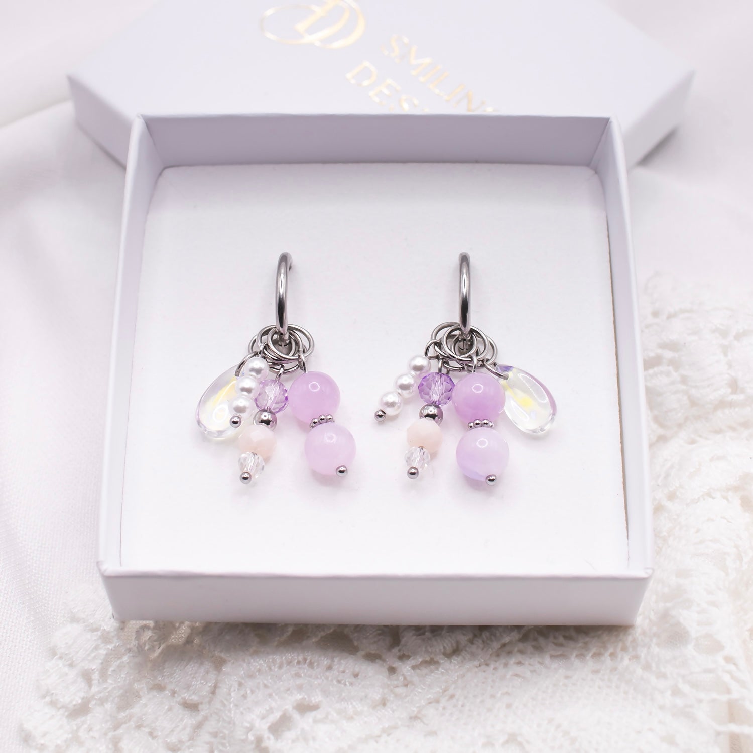 Monipuoliset korvakorut, joissa on erilaisia yhteensopivia helmiriipuksia. Kivenä lila jade.