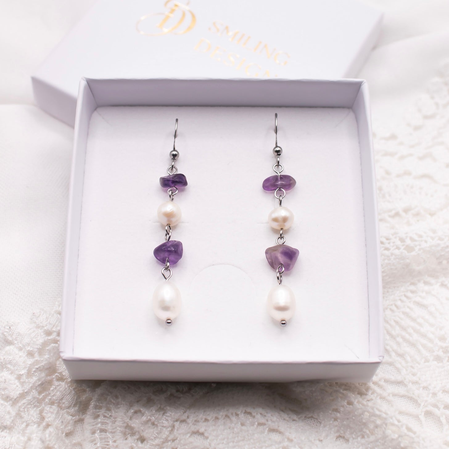 Klassisen kauniit korvakorut, joissa pääosassa ovat kauniit makeanvedenhelmet ja kivisiruhelmet.