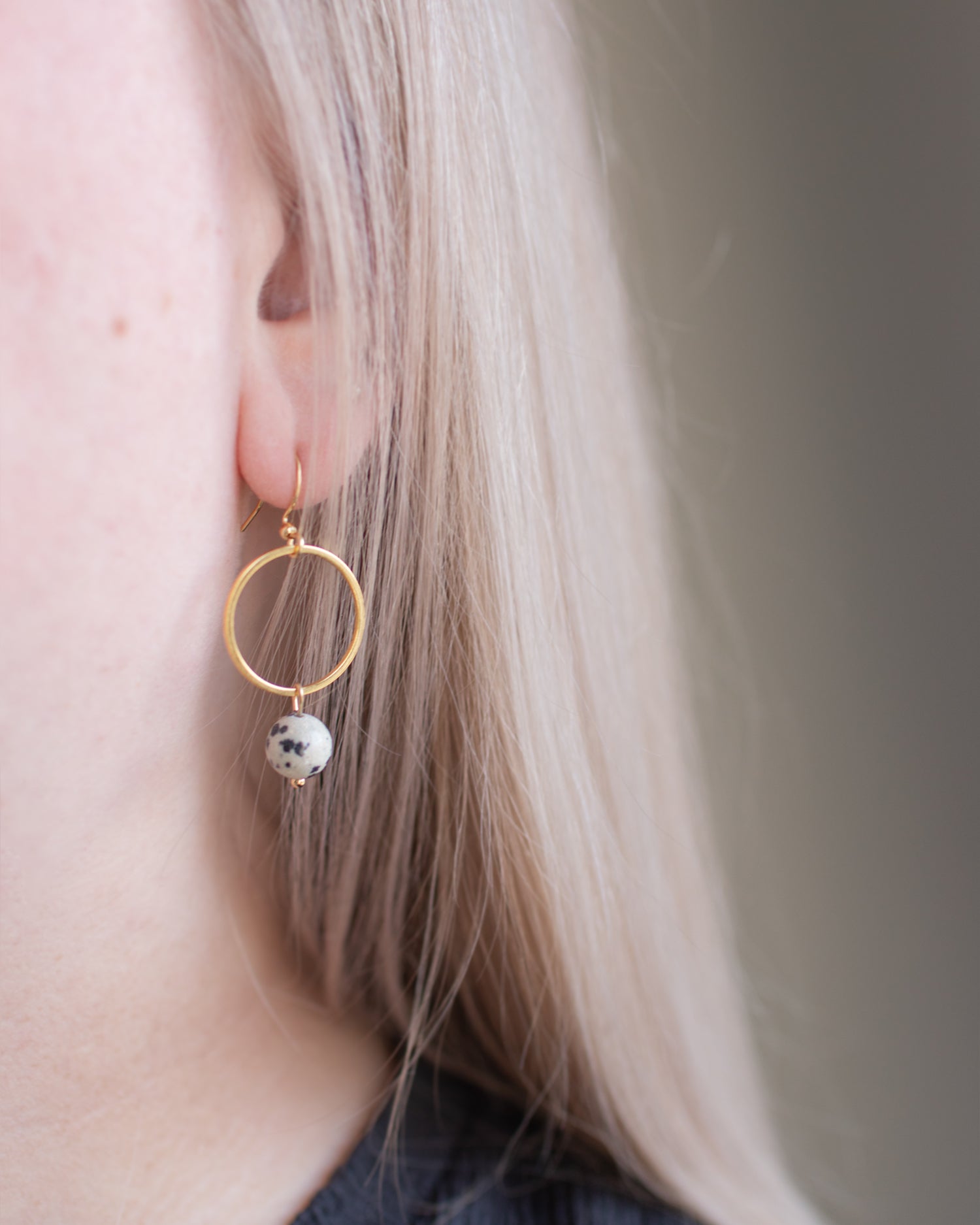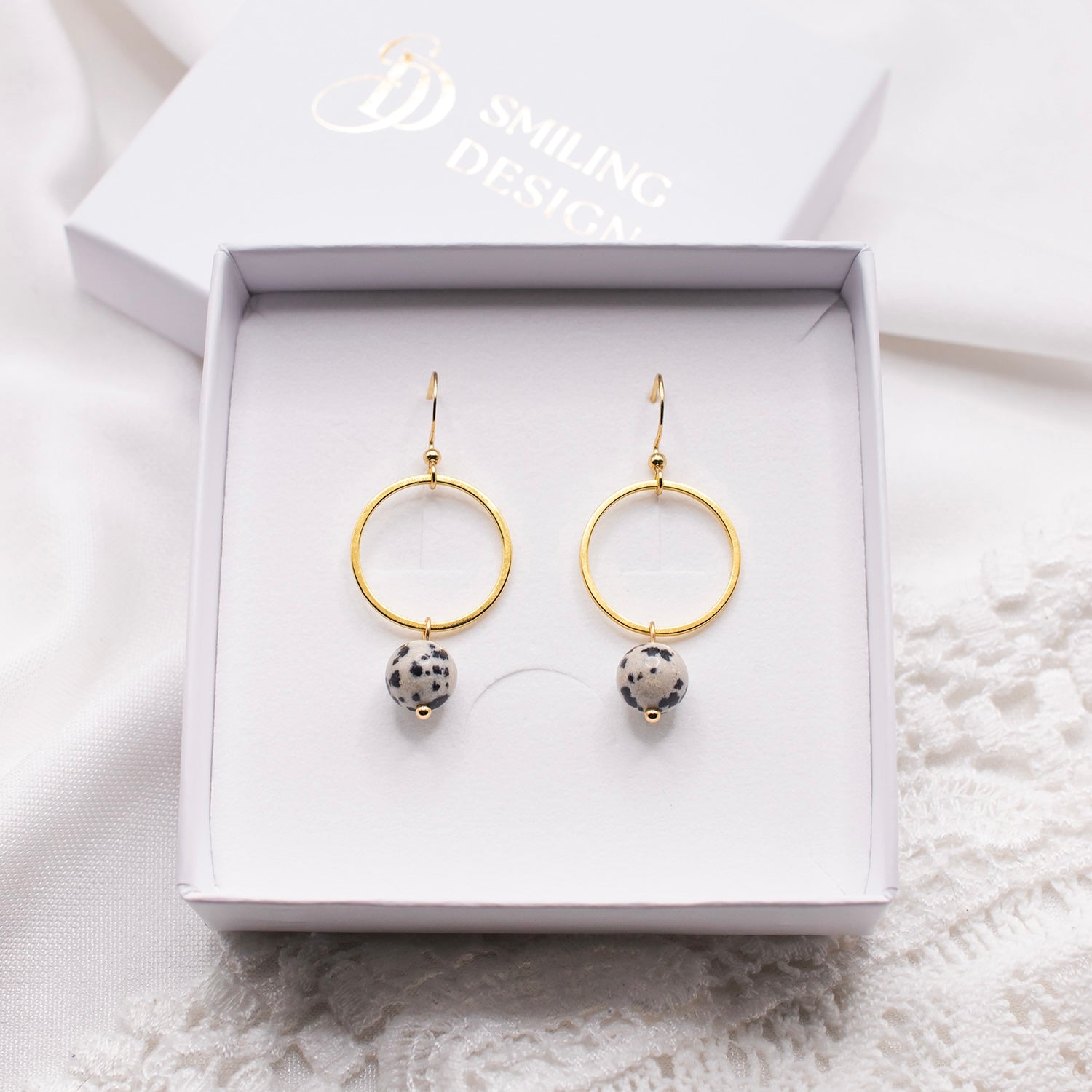 Kauniit, minimalistiset korut, joissa on riipuksena dalmatian jaspis -kivihelmet.