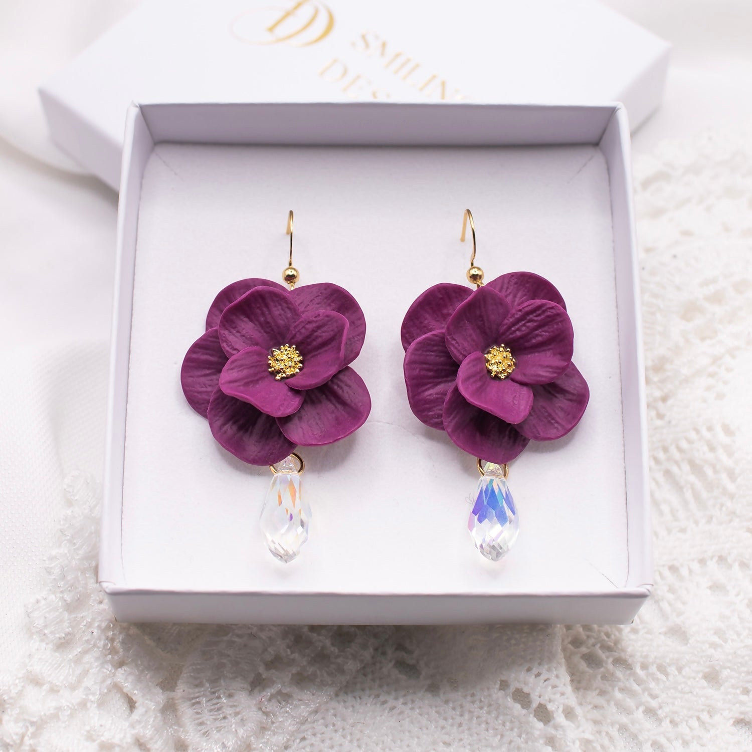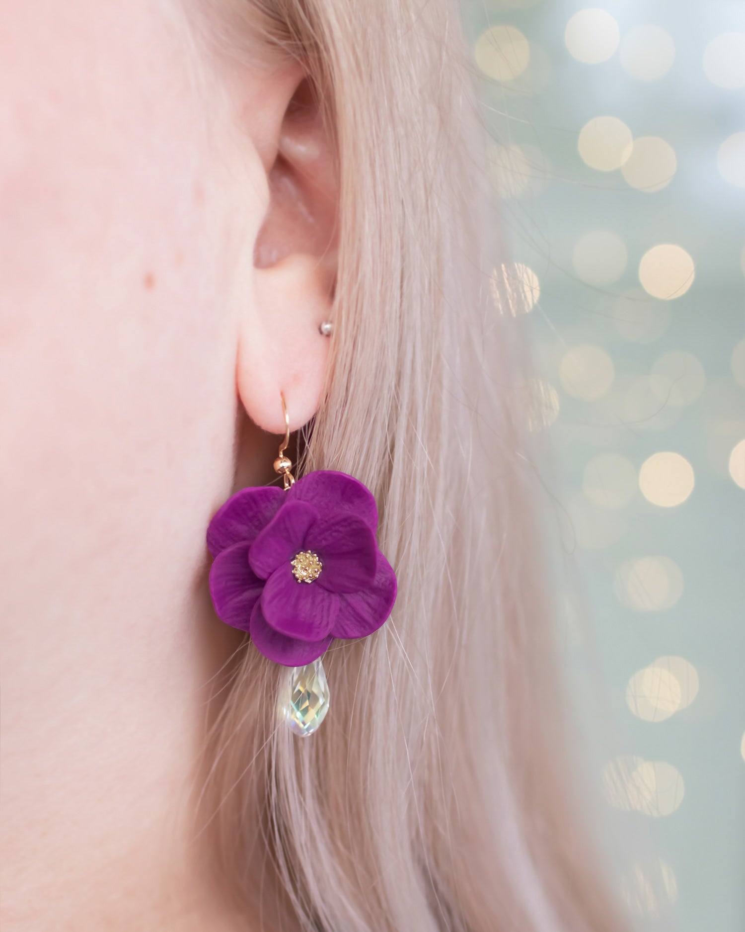 Kauniit kolmiulotteiset kukkakorvakorut. Koruissa on upeat lasiriipukset, jotka heijastavat valoa.