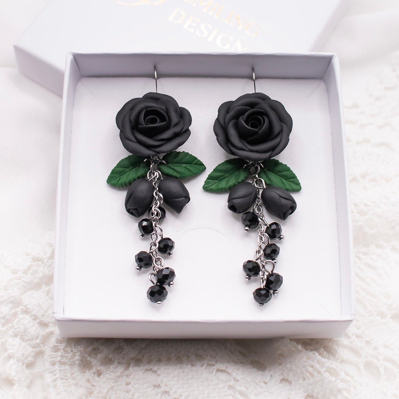 Kauniit ruusun muotoiset korvakorut. Koruissa riipuksina fasettihiottuja lasihelmiä, jotka heijastavat kauniisti valoa.