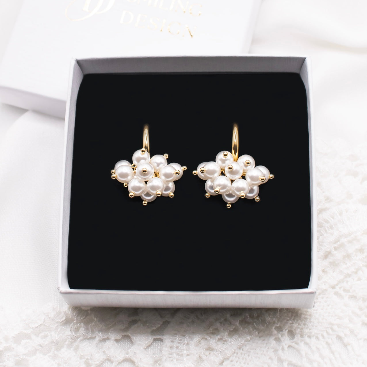 Ihanat korvakorut, joissa on riipuksena runsas kimppu helmiäisvalkoisia helmiä.