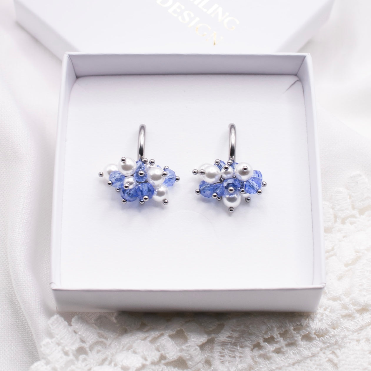 Kauniit helmikorvakorut, joissa on riipuksena runsaasti erilaisia lasihelmiä.