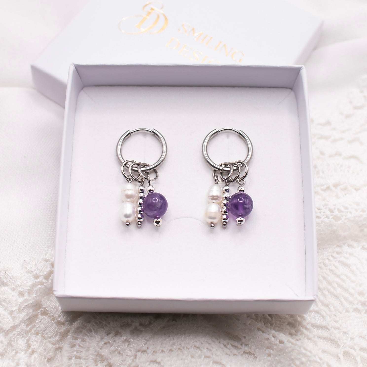 Ajattomat helmikorvakorut, joissa on riipuksina pyöreät kivihelmet, makeanvedenhelmiä ja metallinvärisiä helmiä.